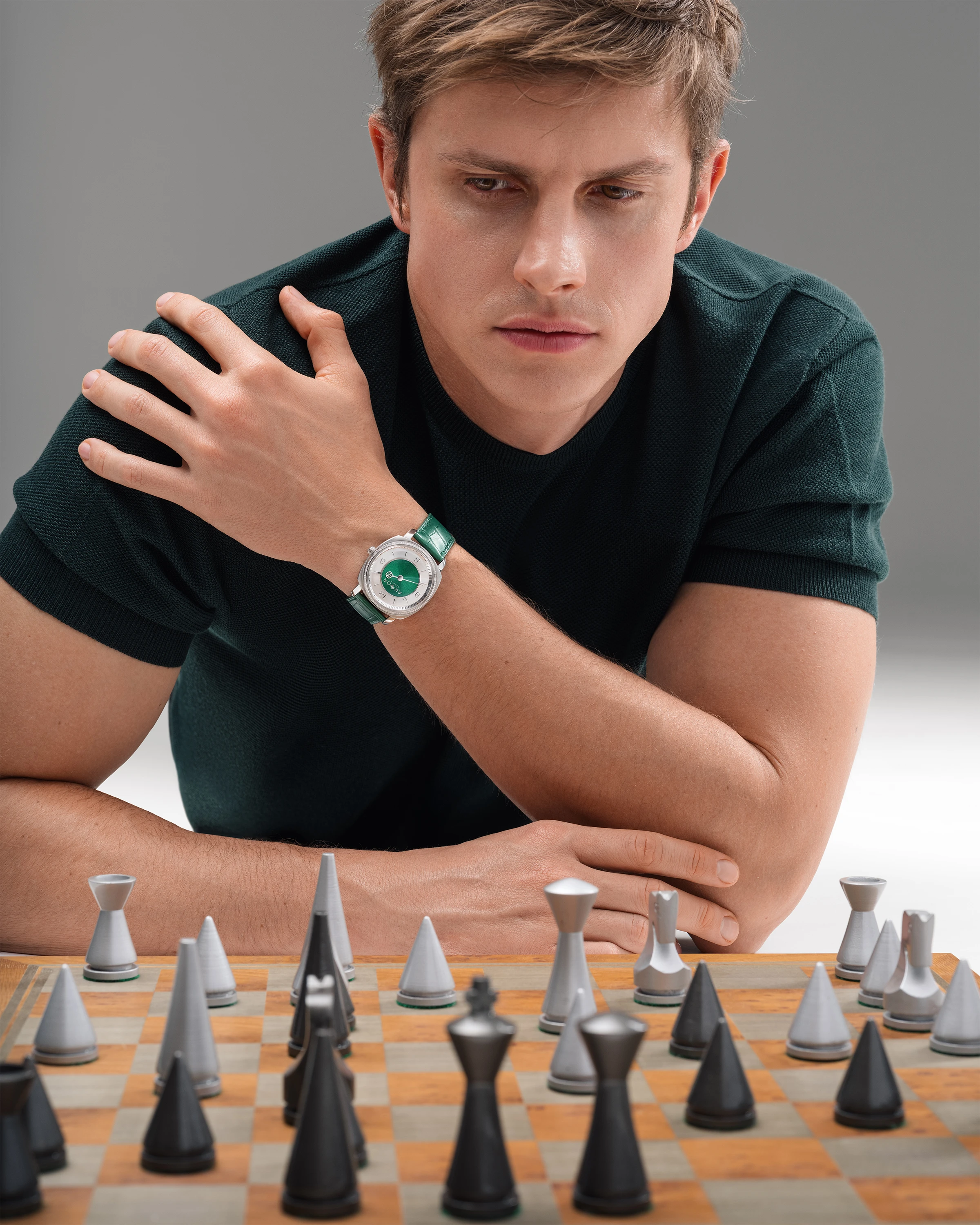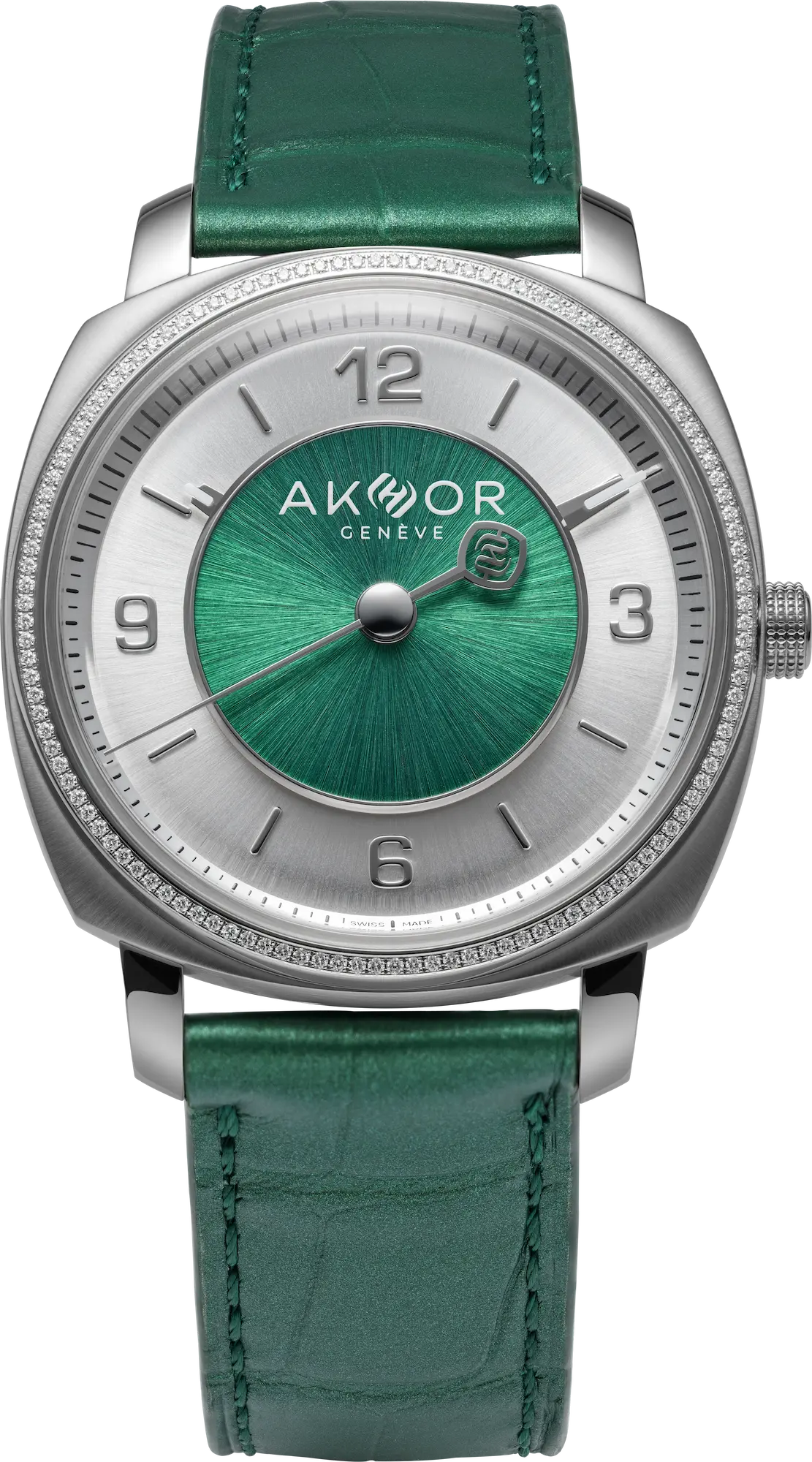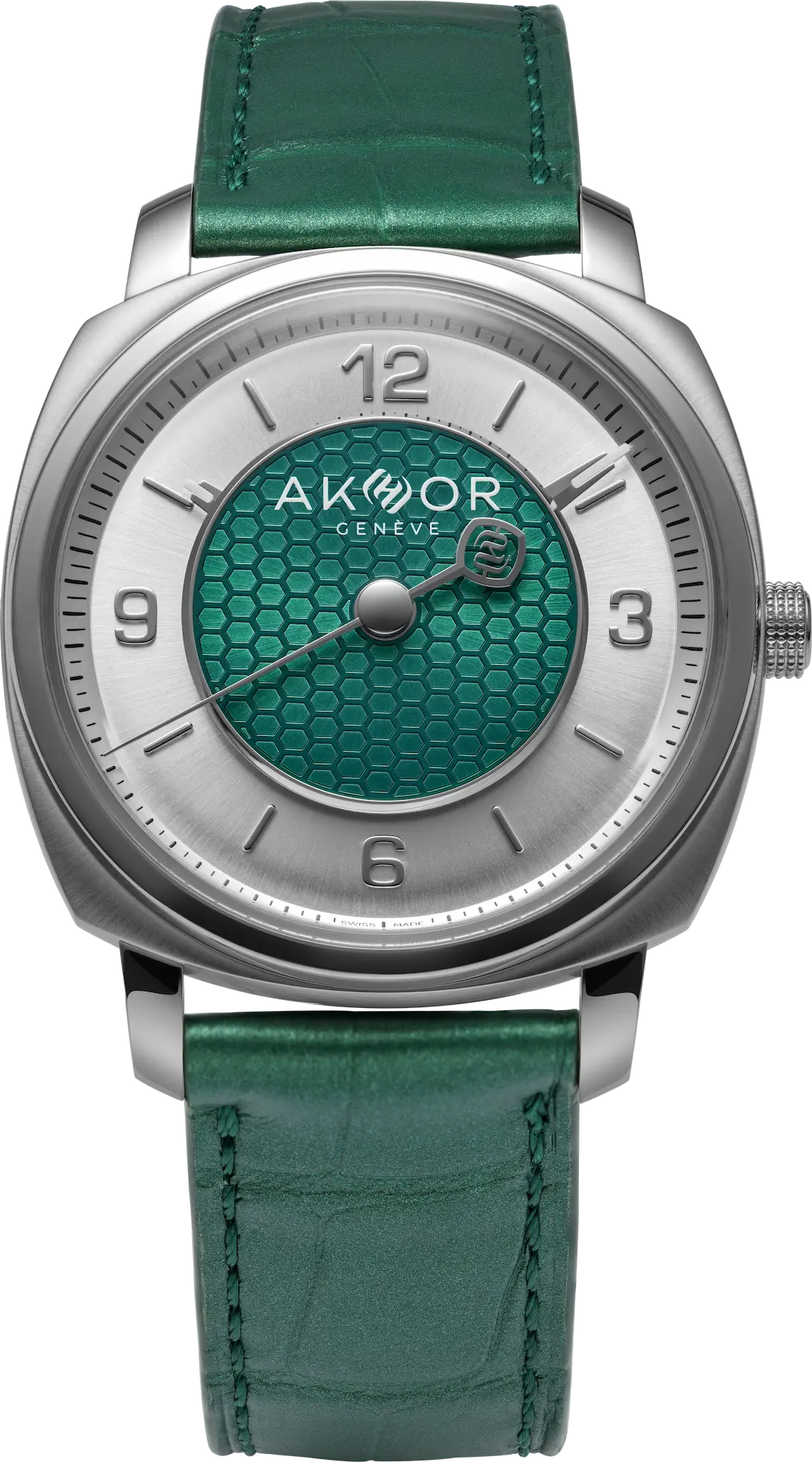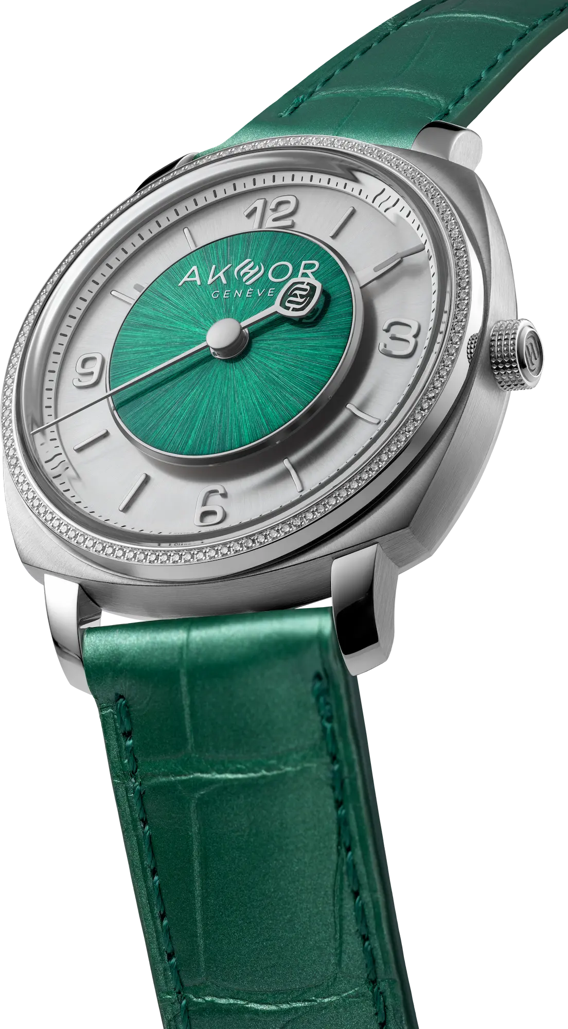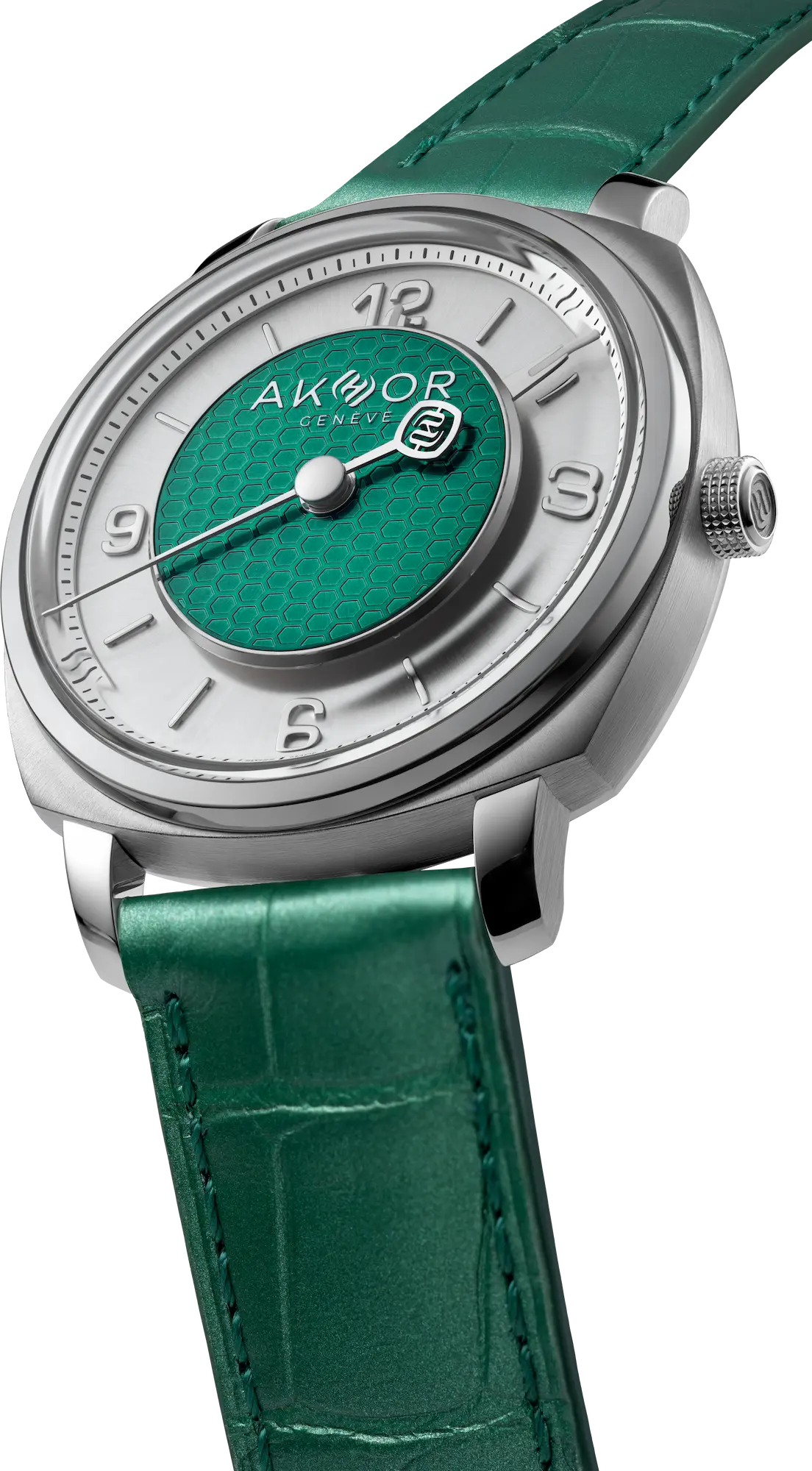 AKHOR explores an active relationship with time through its emerald-green collection, featuring a 39mm steel case with a distinctive dial architecture.